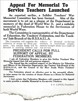 At Federation Council on 21 May 1949 Mr Lewis reported on a meeting he, D A Taylor and W Dobell from the Federation had held with members of the Teachers Sub-Branch of the RSS & AILA. These were Bill Edgar, Ted Lynch, M Gibbons, Ivan (later Sir Ivan) Dougherty, Alan Allan (father of Trevor Allan, Captain of the Australian Rugby Union Wallabies), Col Girdler, David Leithhead, Ian Miller, Ed Bowers and George Harvey. The meeting had discussed proposals for memorialising soldier-teachers, and the representatives had decided to recommend their adoption by their respective organisations. After much discussion and amendments the Council agreed as follows: